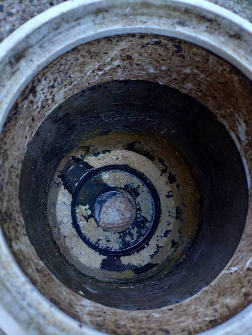 外マスを確認すると、トラップマスのところに油汚れが固まってついている状況でした。