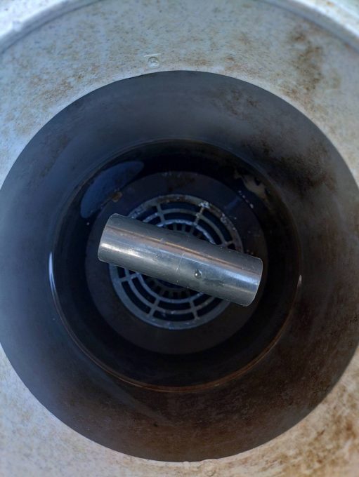 当日は夜遅く高圧洗浄を使用すると近隣に迷惑がかかるので、ドレンクリーナーと言う道具で一旦詰まりに穴をあけ流れるように応急処置しました。